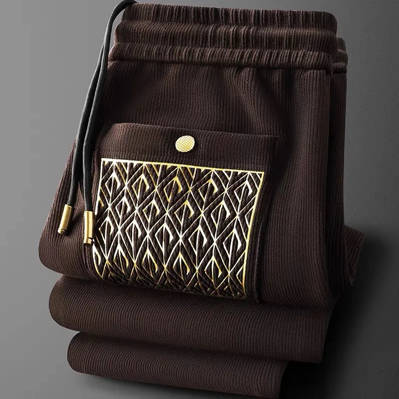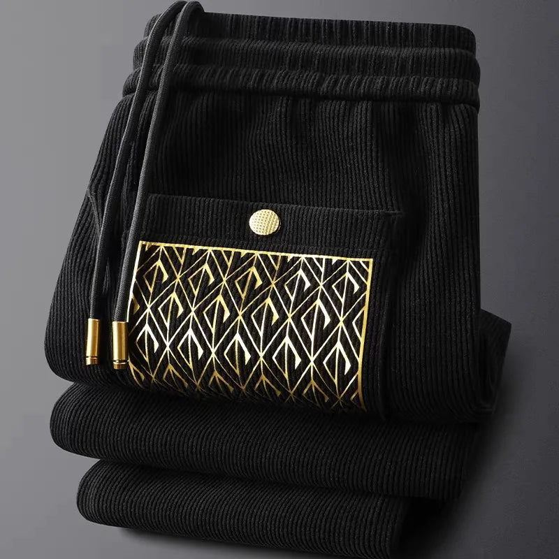 Descubra um novo padrão de estilo com as nossas calças exclusivas. Feitas de uma mistura de algodão única com textura canelada e detalhes em fio dourado, estas calças oferecem conforto durante todo o dia, tornando-se a escolha perfeita para qualquer ocasião.