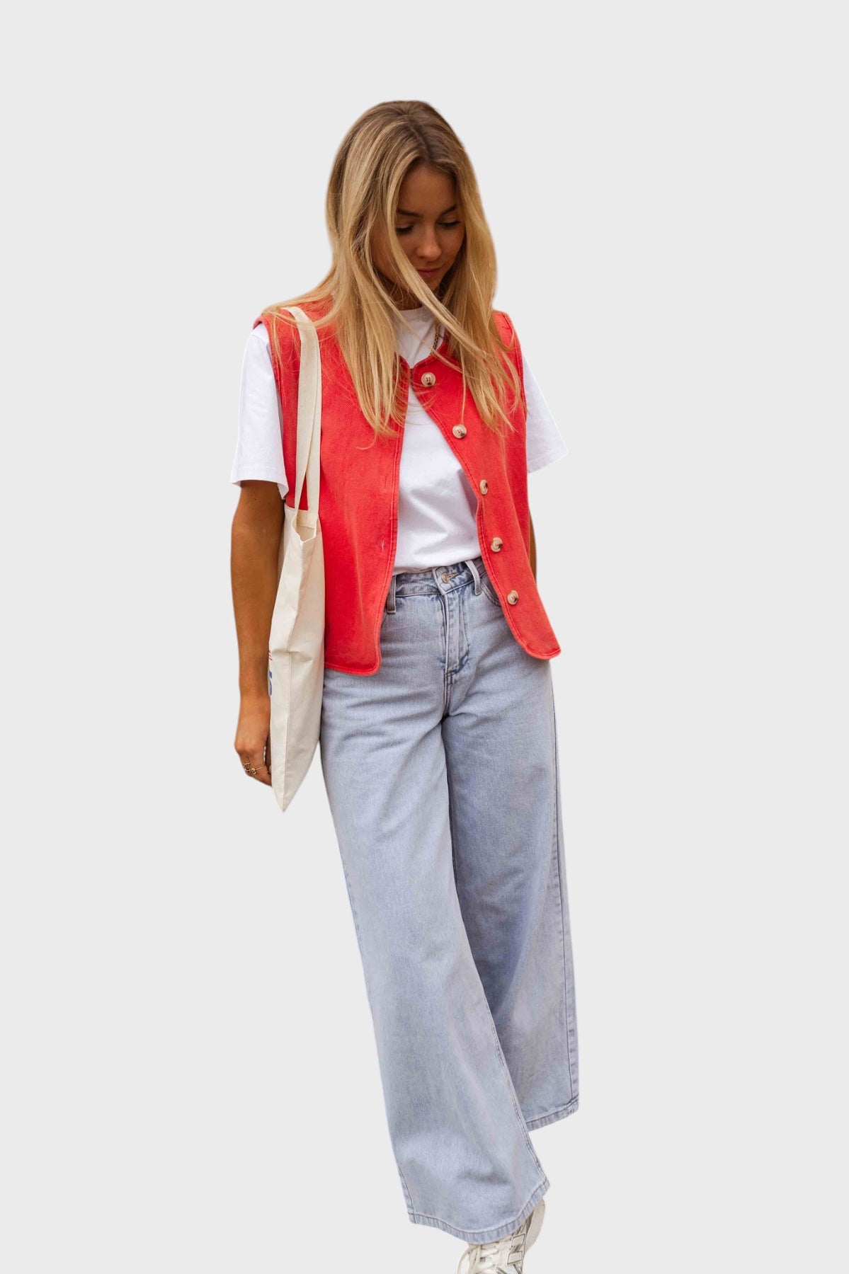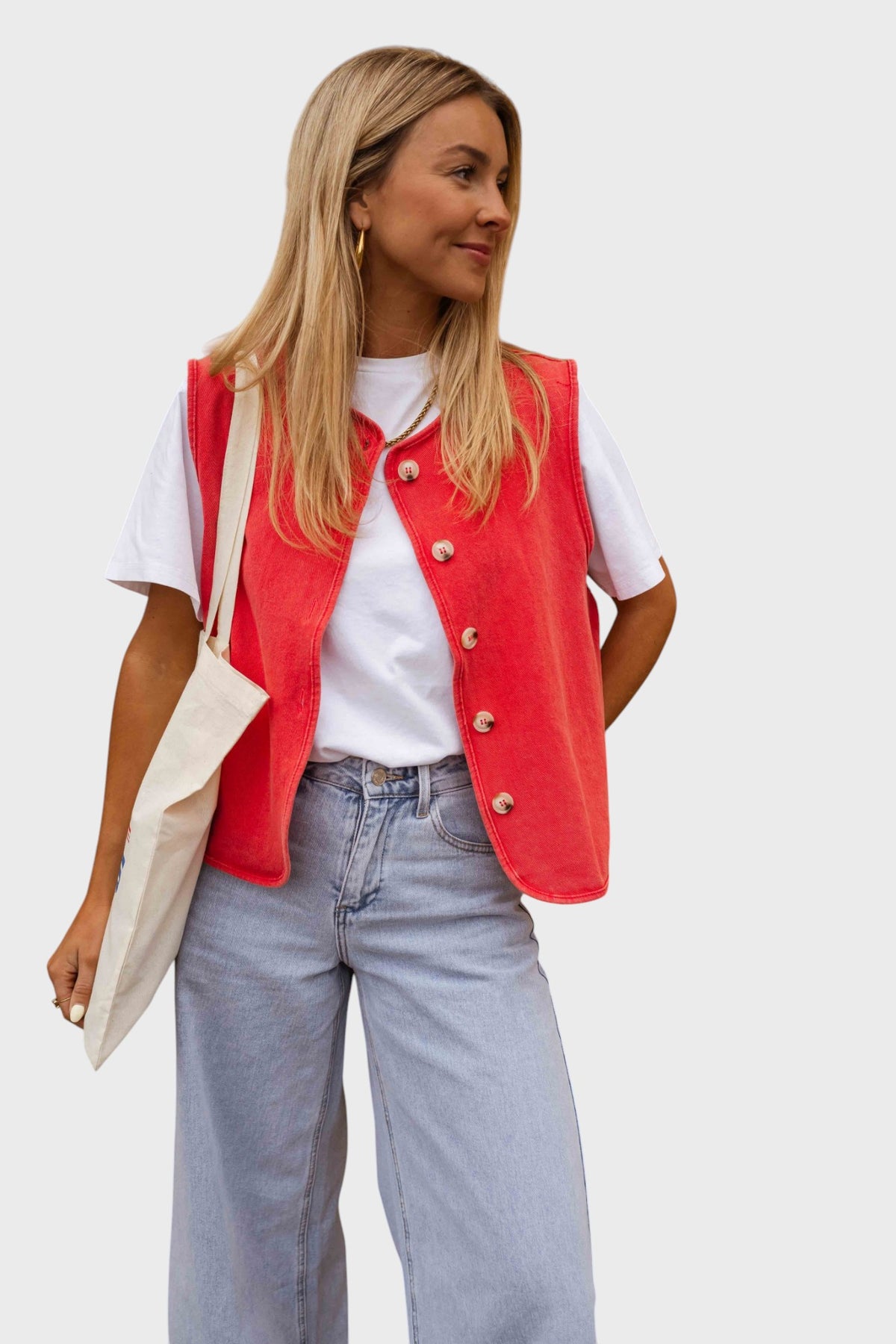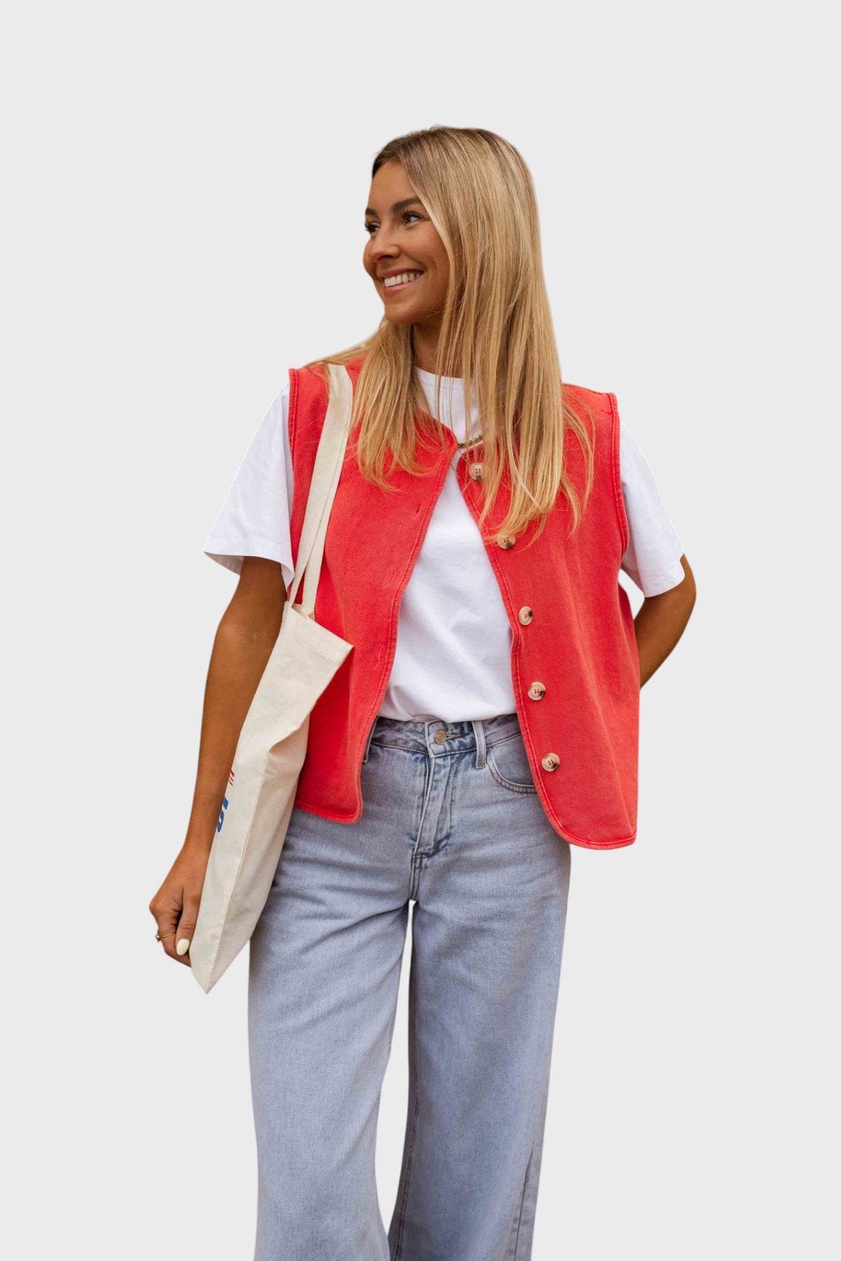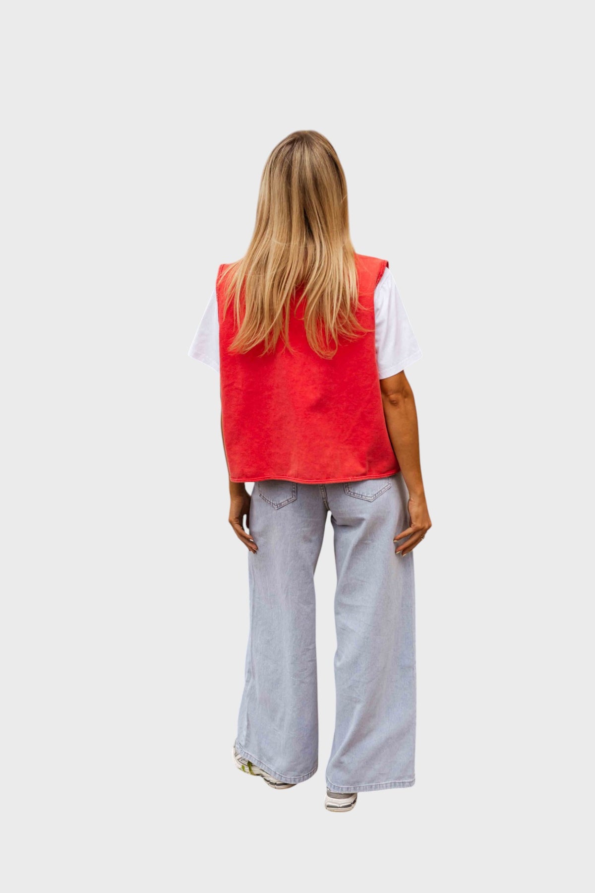 Adicione um toque fresco ao seu guarda-roupa com o Colete de Verão. Este colete moderno e descomplicado é perfeito para dias quentes, apresentando um tom vermelho intenso e uma aparência ligeiramente desbotada que confere um charme especial.