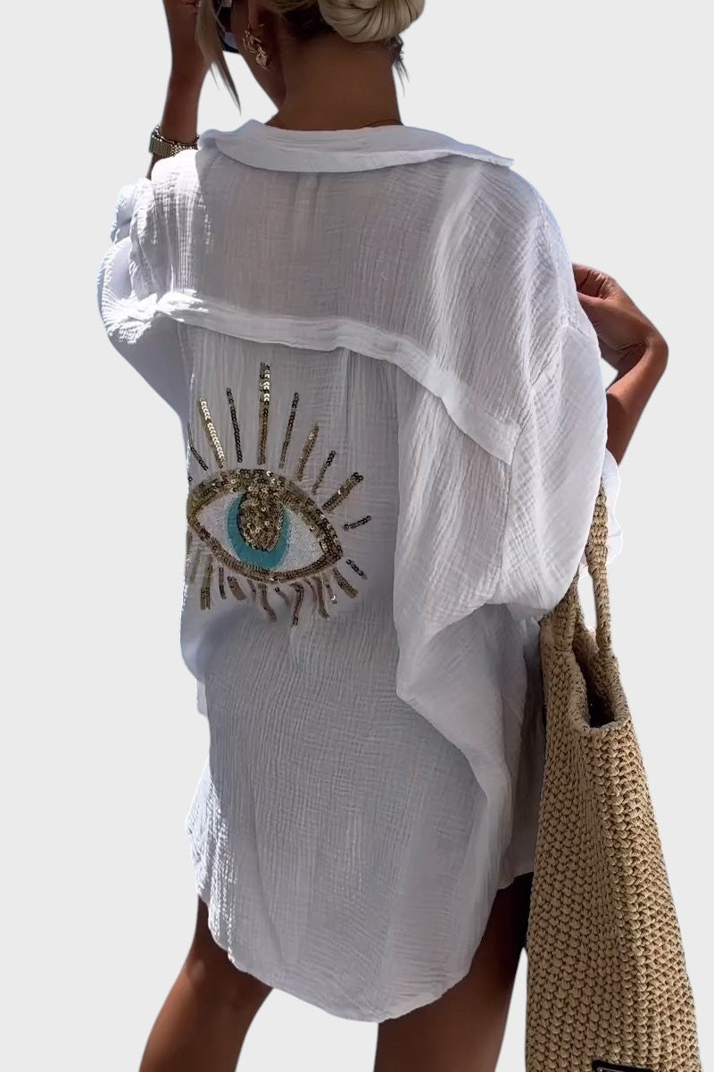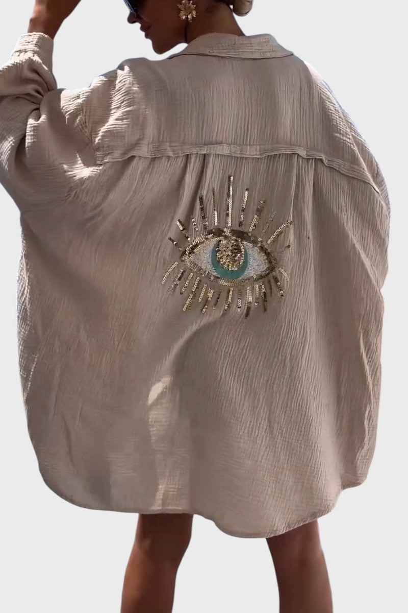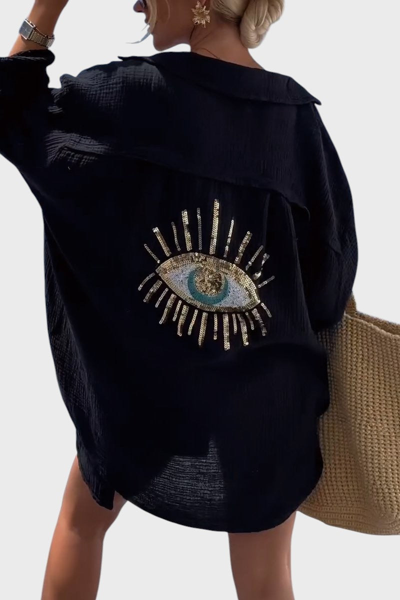 Adicione um toque glamoroso ao seu guarda-roupa de primavera e verão com a nossa blusa, que apresenta um distinto padrão de olhos. Este modelo casual com botão oferece um corte solto para garantir conforto elevado e um visual estiloso sem esforço – perfeito para qualquer ocasião.