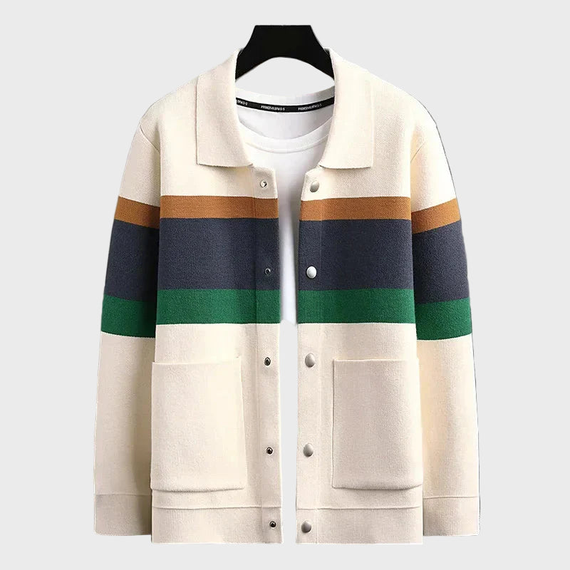 Descubra o nosso cardigan com assinatura de listras desenhada internamente, que redefine o requinte casual. Leve e ajustado, sua silhueta favorece sobreposições, enquanto o colarinho dobrável elegante, fecho de botão e bolsos práticos garantem sofisticação em cada detalhe.