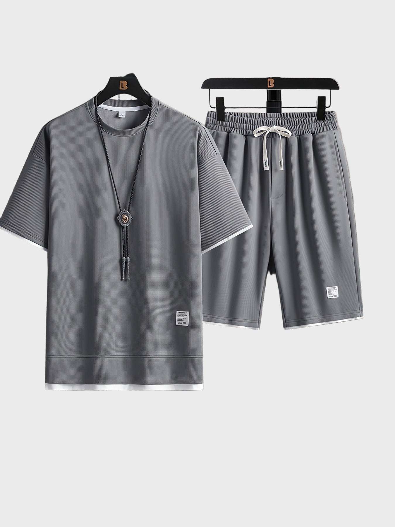 Descubra o Conjunto de Lounge, a adição perfeita à sua rotação de roupas de lazer. Com uma t-shirt de corte descontraído e calções com cordão a condizer, este conjunto de duas peças oferece: