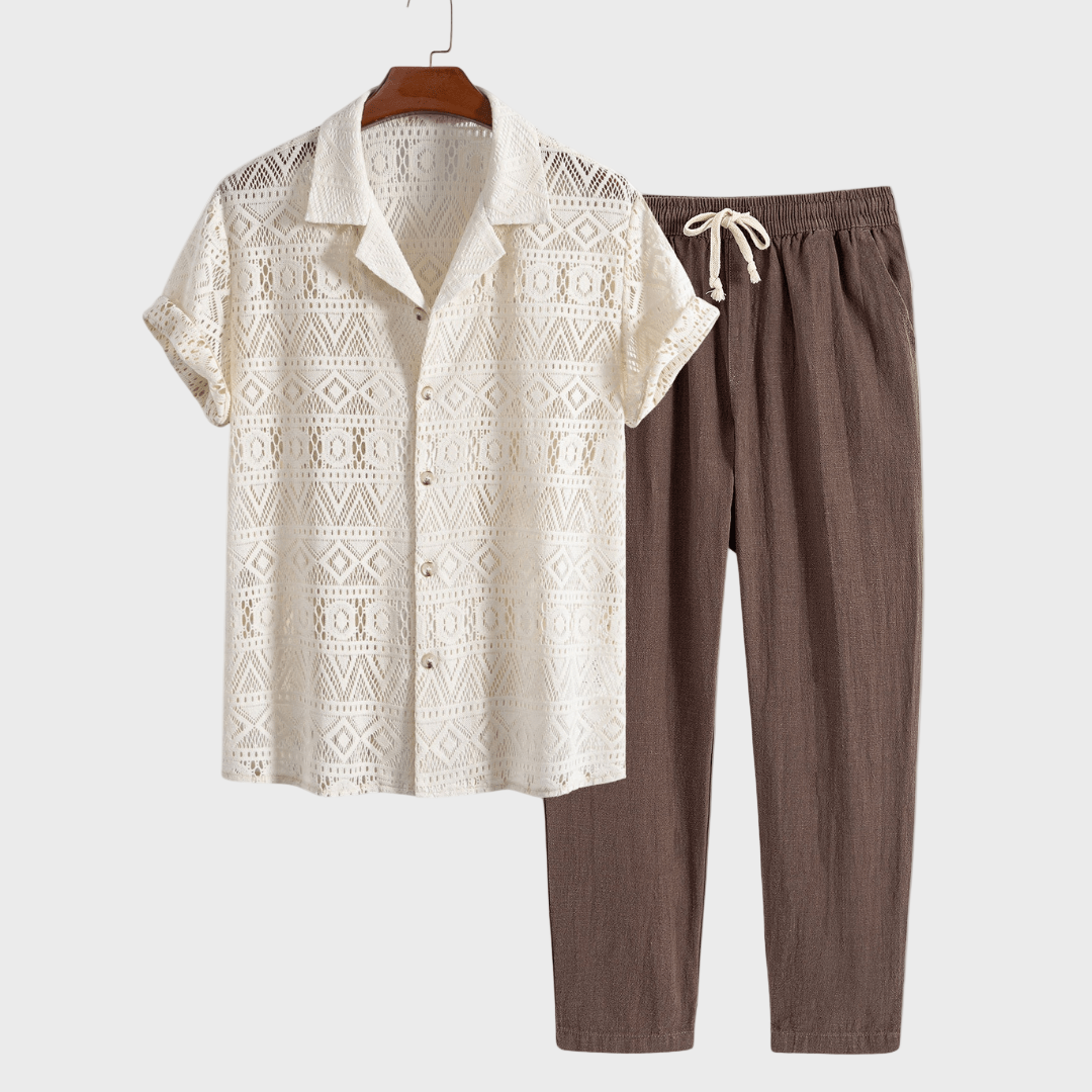 • Calças: Luxuosa mistura de algodão e linho, oferecendo suavidade e durabilidade.