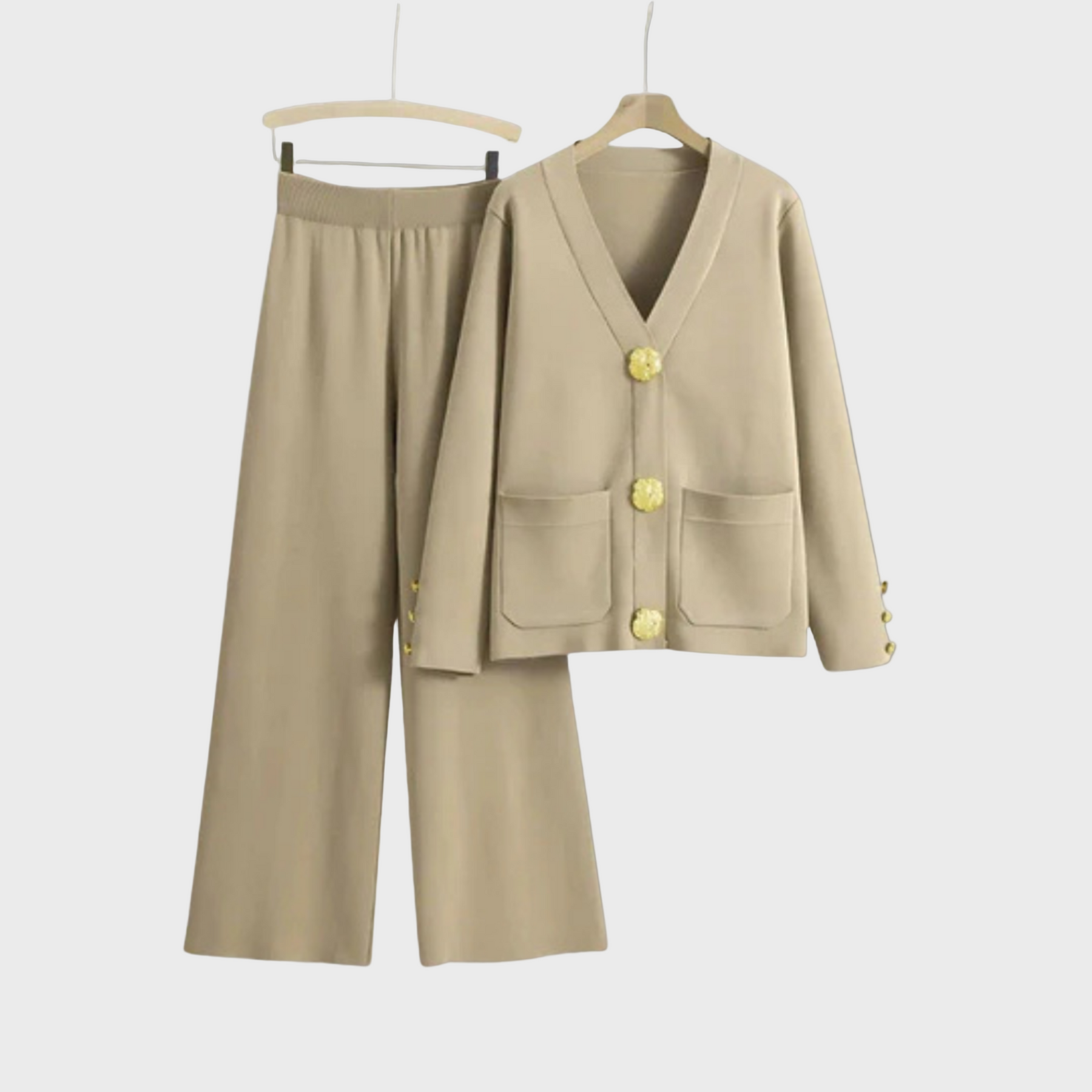 Eleve o seu guarda-roupa com o Conjunto Elegante de Duas Peças Zulmira, a combinação perfeita de estilo e conforto. Com um blazer ajustado de decote em V e botões dourados em destaque, e calças de perna larga, este conjunto chique é ideal para qualquer ocasião, desde o escritório até eventos elegantes.